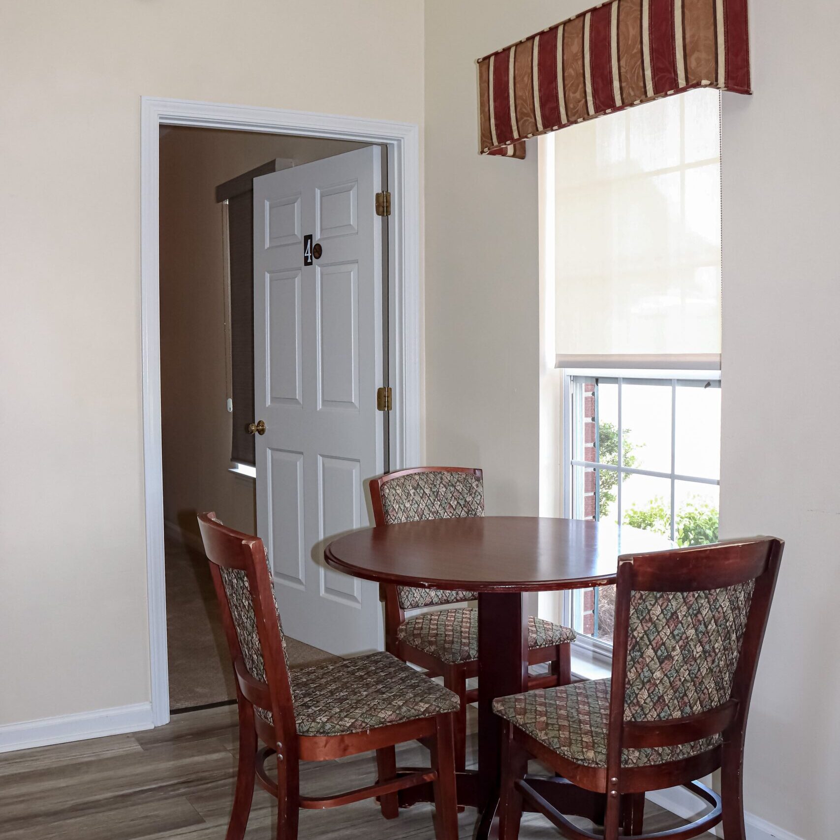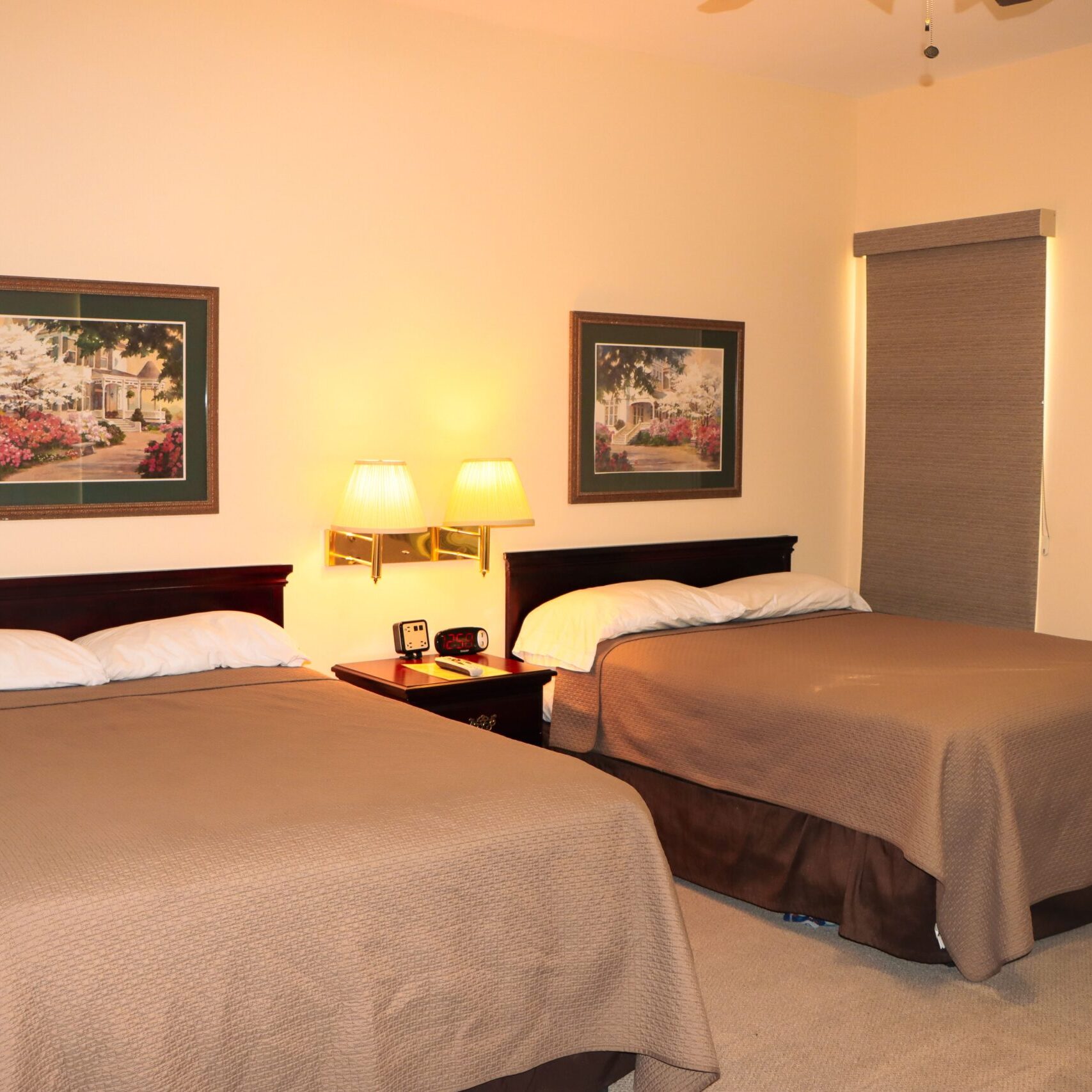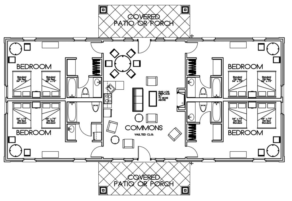The arrangement of the bedrooms opening into the common living area provides the amenities of the cottage to all. Each bedroom features two full-size beds, private bath, satellite television and a small refrigerator.